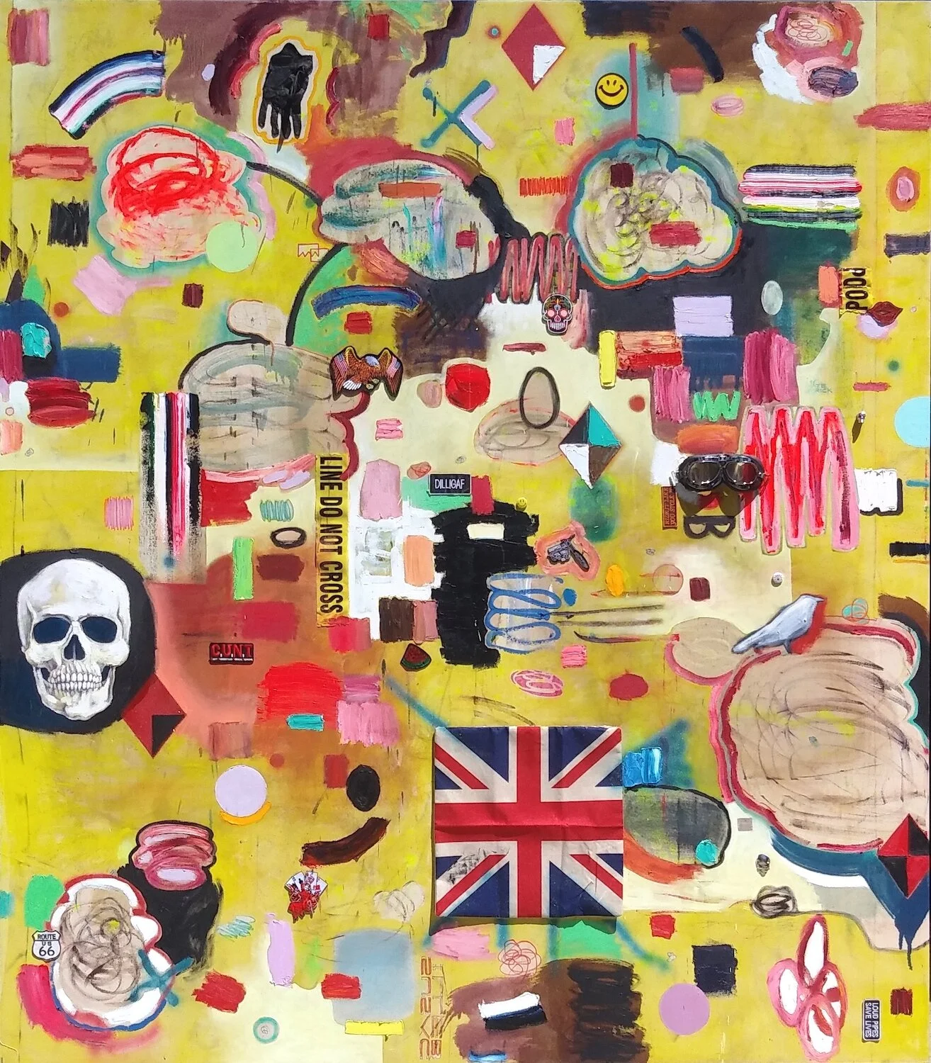 Parallax #36 2020-24 oil, acrylic, motor oil, tea, enamel, patches, badge, metal ornament skull, plastic tape, leather glove on canvas 84 x 66 inches
