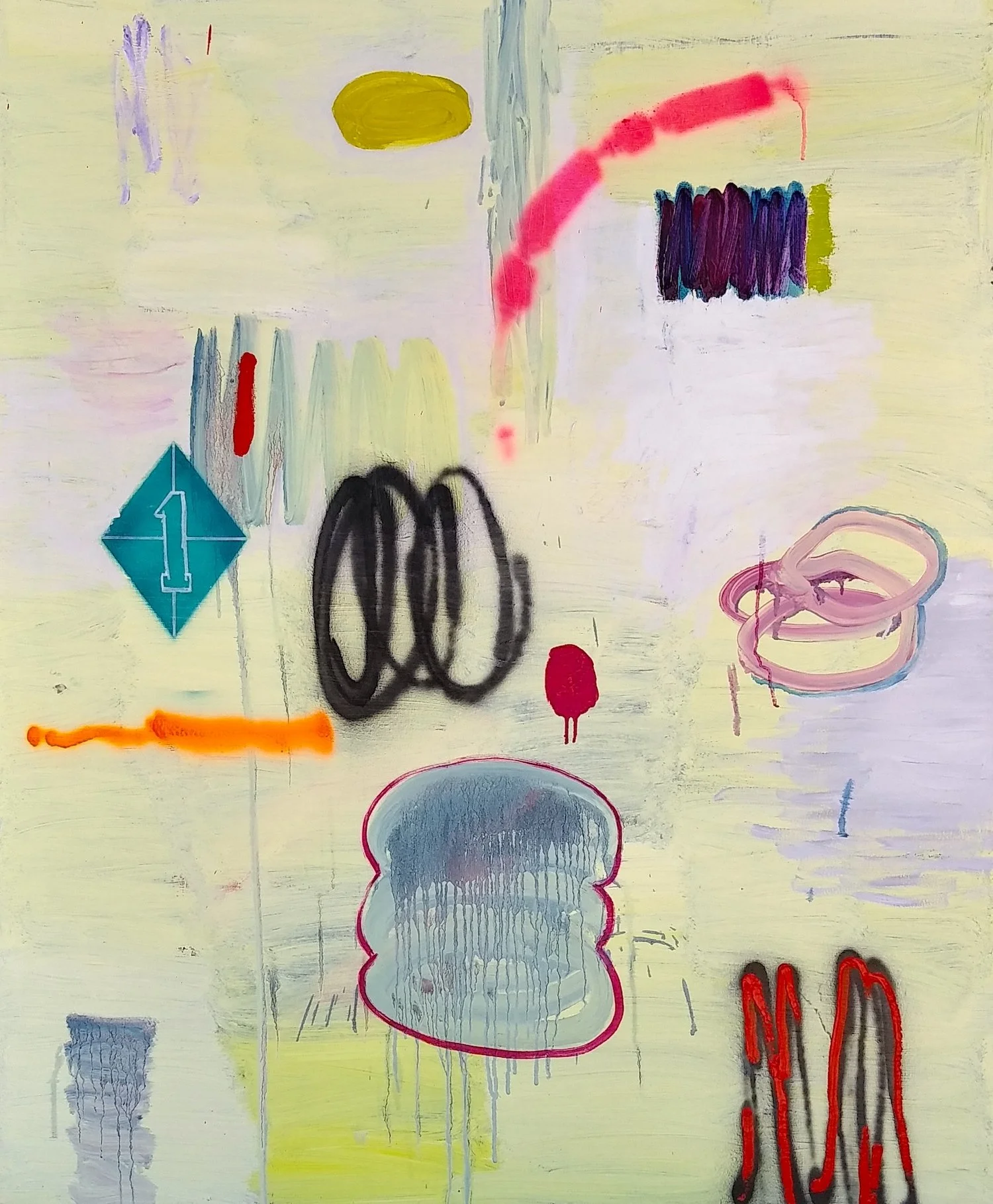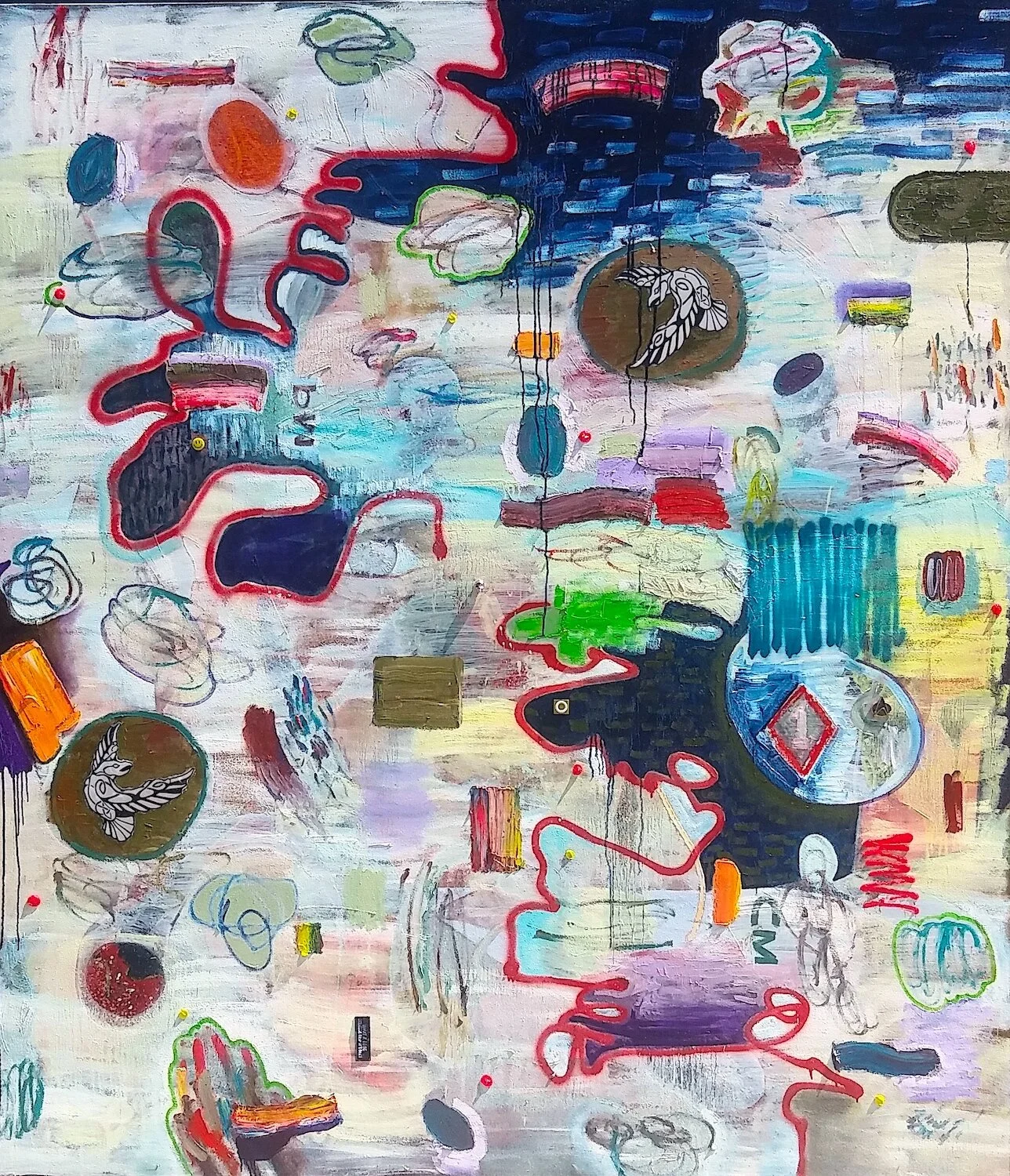Parallax #30 (nee RD143) 2023 Oil, spray paint, sticker, photo transfer on canvas 84 x 104 inches