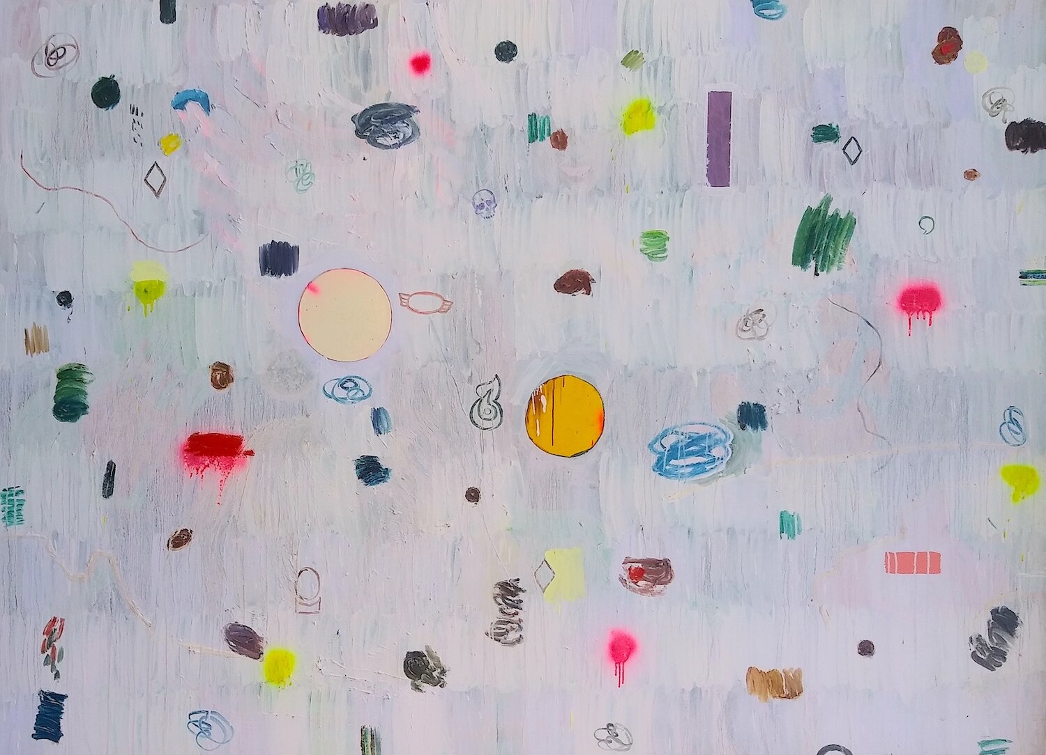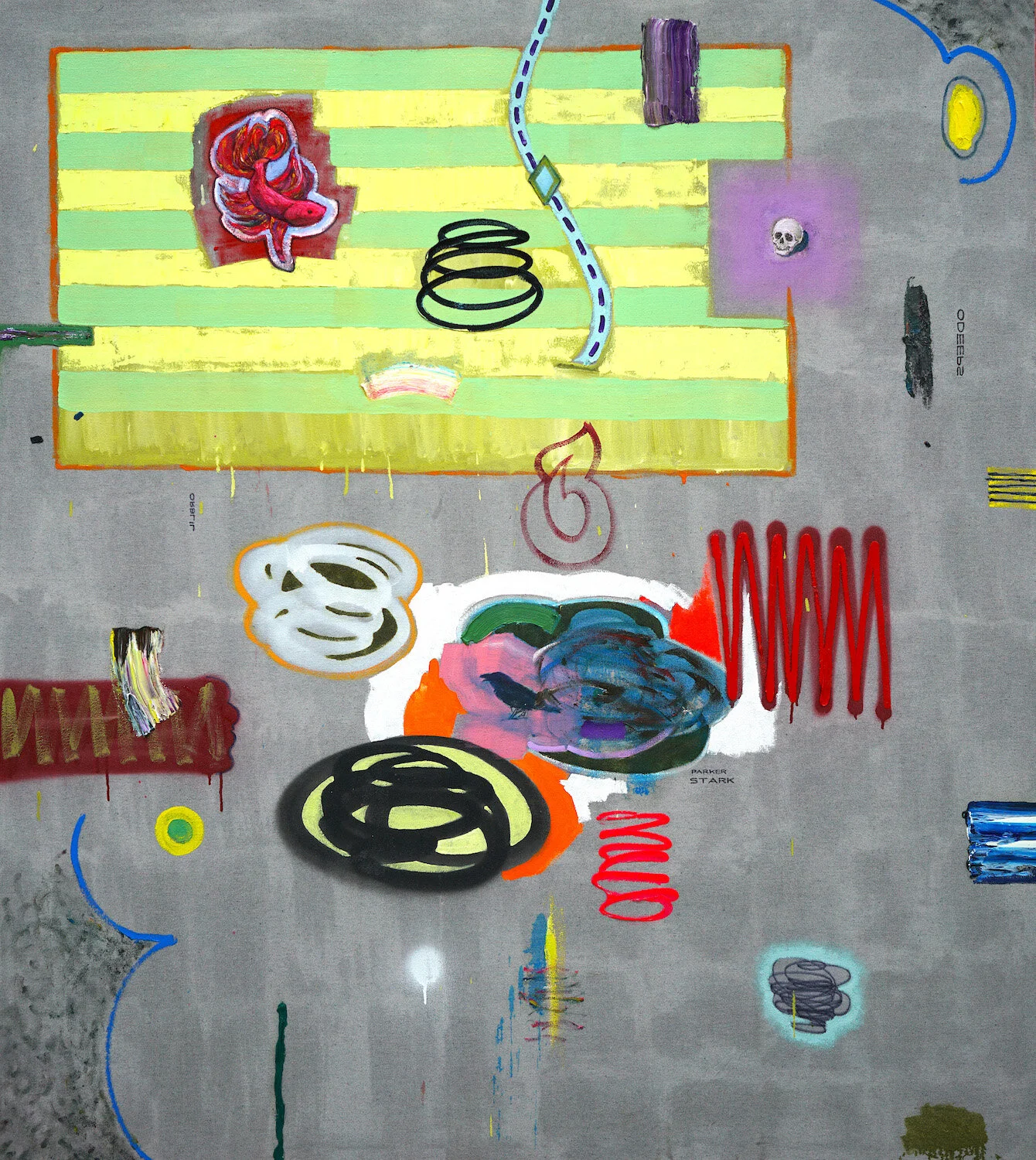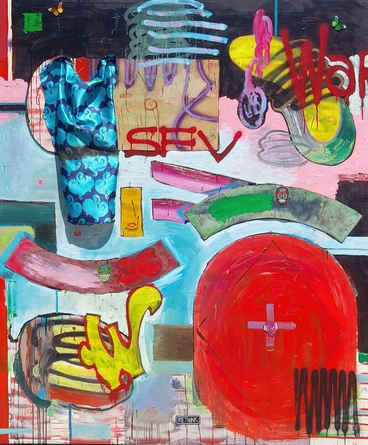 MiT #111 2020 oil, acrylic, enamel, motor oil, patch, badge, metal ornament skull on canvas 22 x 20 inches