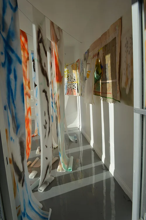 What started out as bravado became a code that morphed into an investigation of trauma. In choosing a more abstract format, I have centralized negation and painting as palimpsest in the service of exploring the tension between the explicable and the inexplicable. Negation and the act of covering produces a hierarchy of things allowed to speak and things that are censured. Scraping, building layers, and the use of taping to create patterning (screens, barriers, obfuscation, and noise) against organic ephemera enable me to find a space that embodies a representation of confrontation and incomprehensibility that defies categorization through language structures and resides in the visceral. Mountains, monsters, and cosmos are recurring themes in my work, weaving together landscape, mythology, and the double edged sword of wonder.